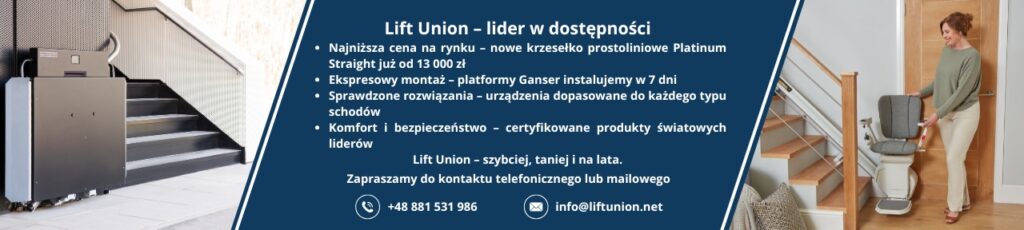Jeśli mierzysz się z problemami związanymi ze starzeniem się czy zdrowiem lub chcesz zadbać o swoich bliskich, to w Liftunion pomożemy znaleźć Ci rozwiązania, które ułatwią codzienne funkcjonowanie. Nasza oferta obejmuje szeroki wybór krzeseł, platform schodowych i wind kabinowych, dzięki którym bezpiecznie i wygodnie pokonasz schody. Niezależnie od tego, czy potrzebujesz rozwiązania dla budynków użyteczności publicznej, czy też chcesz zadbać o komfort swoich bliskich, znajdziesz u nas wszystko, czego potrzebujesz.